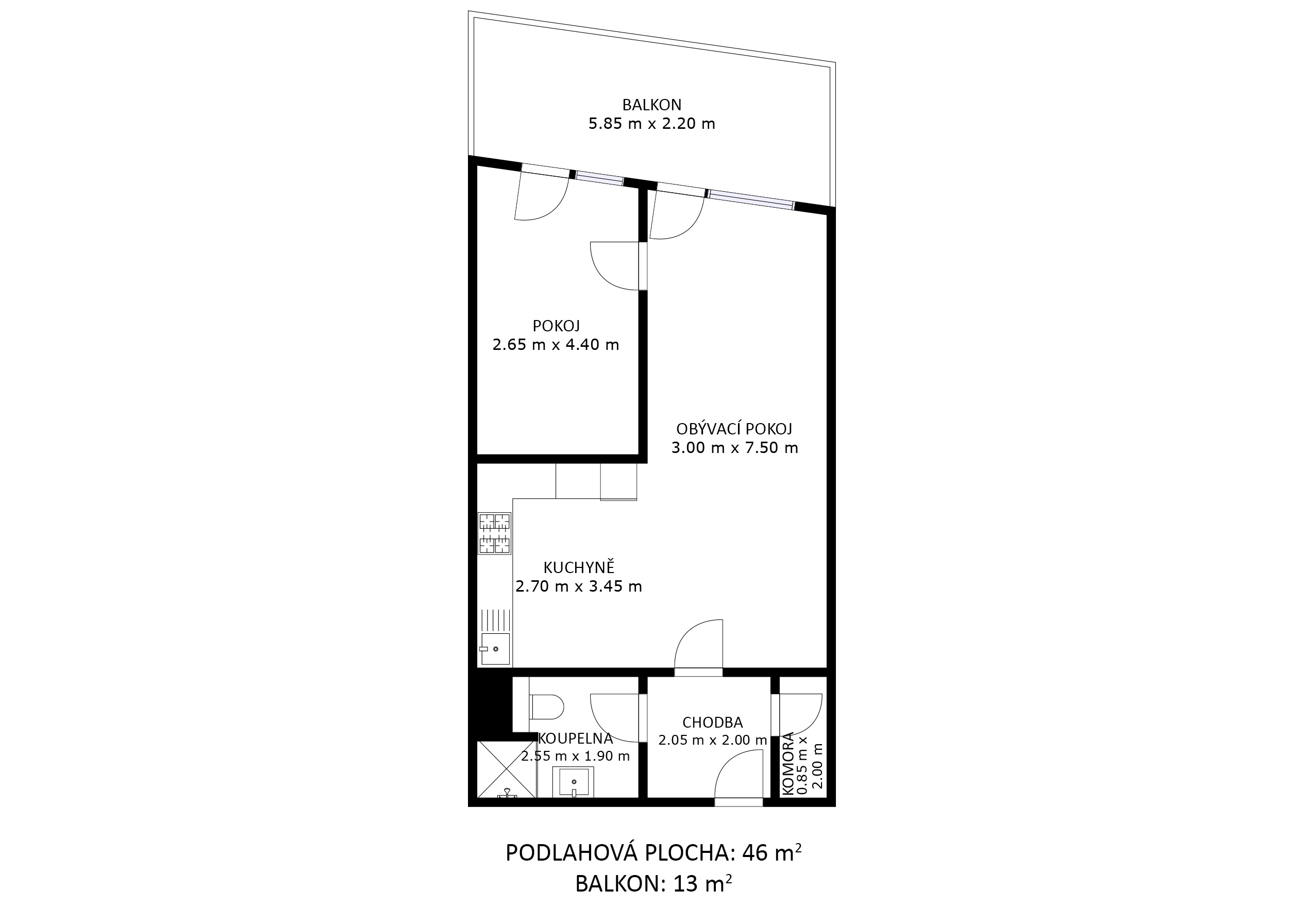 Plocha bytu: 56 m² + 11 m² balkón + 3 m² sklep
