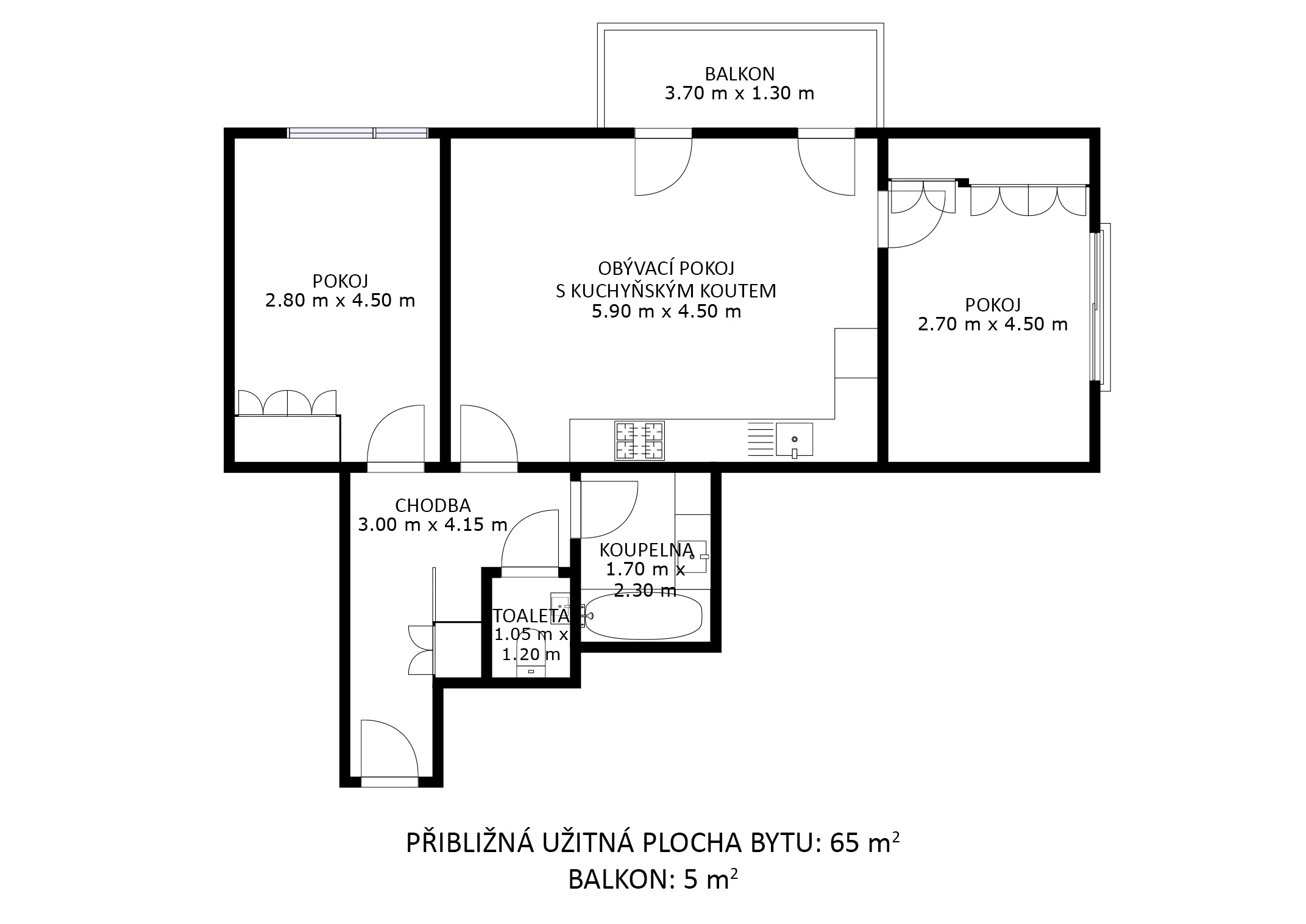 Celková plocha bytu je 73,7 m² včetně balkonu a sklepu. Užitná plocha bytu je cca 63 m².