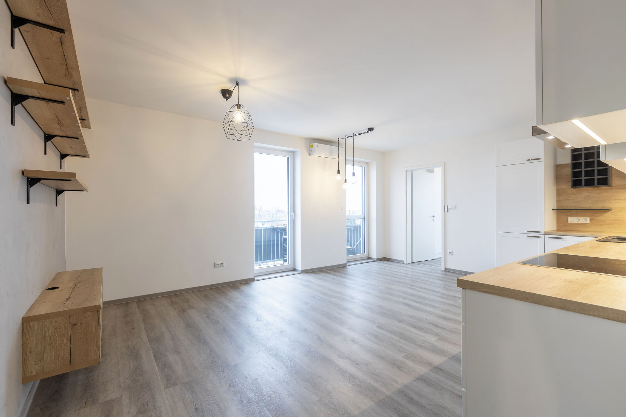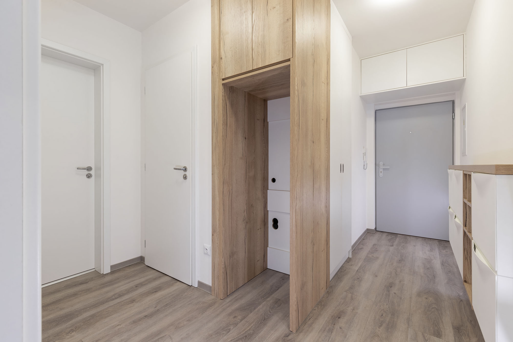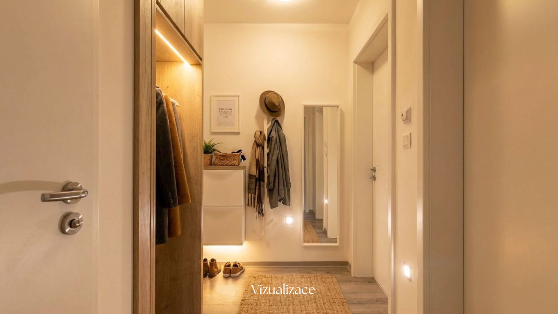 Dispozice bytu zahrnuje vstupní halu s chytře využitým prostorem vestavěnými skříněmi (včetně na míru připraveného místa pro pračku a sušičku) a prostorný obývací pokoj s kuchyňským koutem. V bytě je dále komfortní ložnice, další pokoj vhodný jako pracovna nebo dětský pokoj, koupelna, samostatné WC a balkon.