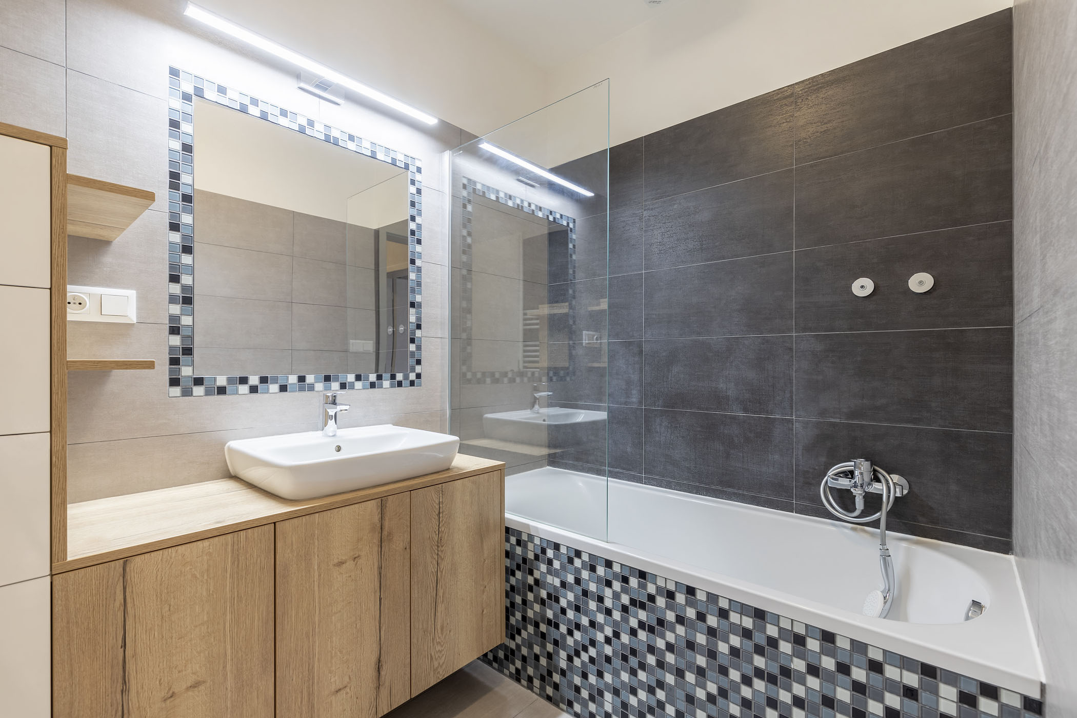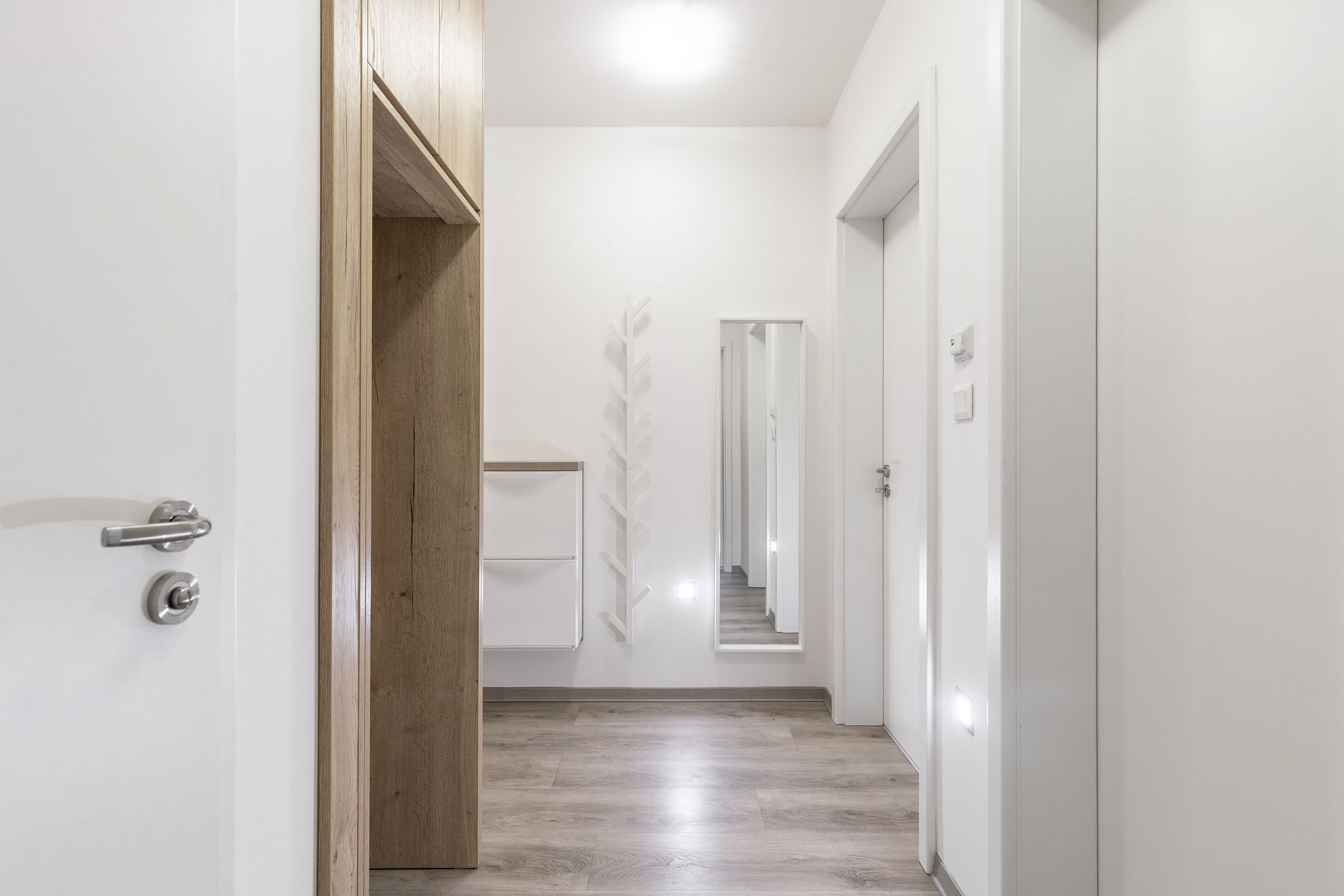 Koupelna je vybavena vyhřívaným zrcadlem proti zamlžení, praktickými zásuvkami integrovanými do šuplíků a držákem/nabíječkou na elektrický kartáček, což ocení každý, kdo si potrpí na detail. Podlahy jsou vinylové, odolné a snadno udržovatelné.