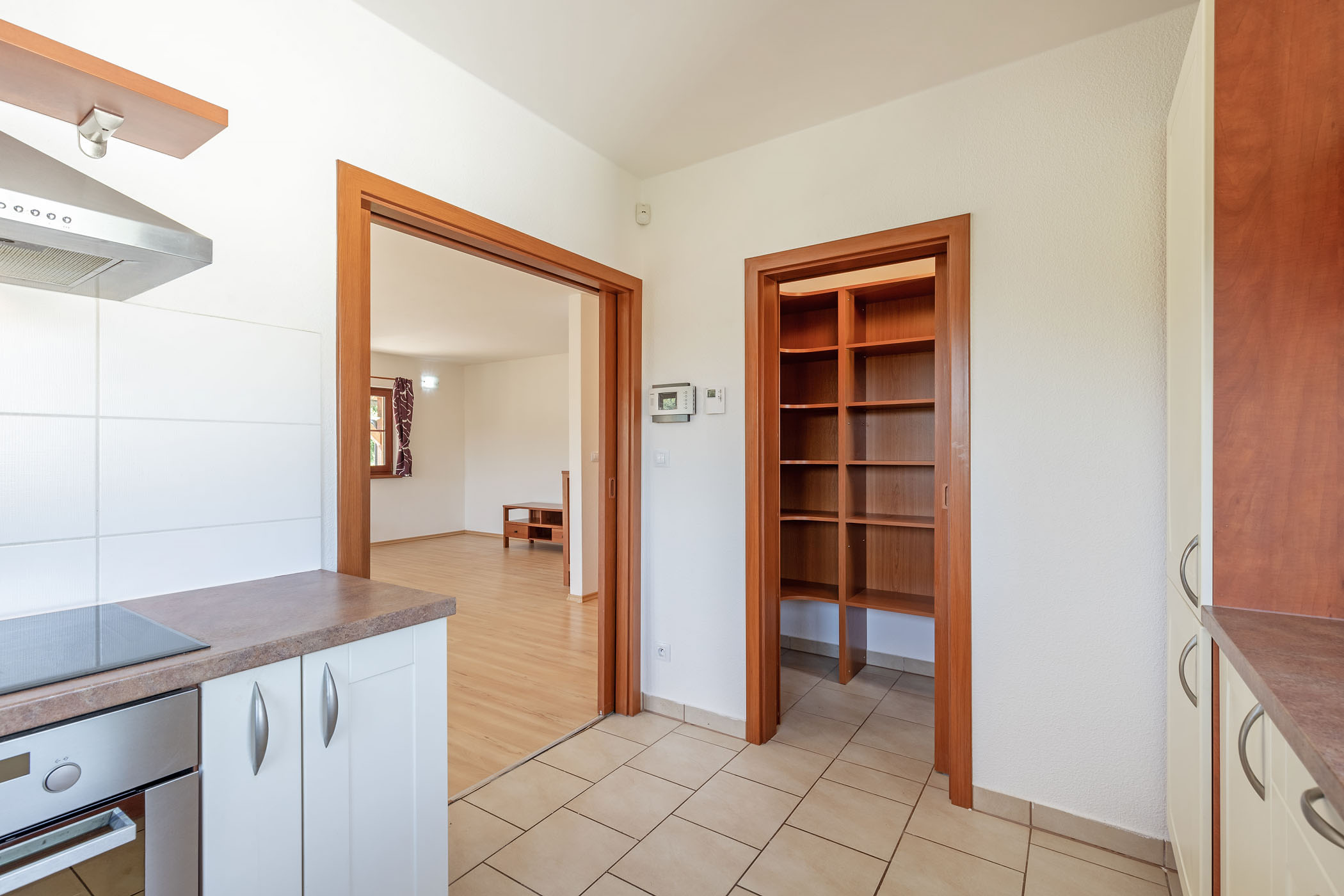 Přízemí je určeno především k rodinnému životu. Dominantou je velký obývací pokoj, který přímo navazuje na kuchyň se spíží a jídelním koutem. Odtud je přístup na slunnou terasu a do zahrady – ideální místo pro rodinné grilování či odpočinek u kávy. V přízemí se dále nachází pracovna (vhodná i jako pokoj pro hosty), koupelna, samostatné WC a vstupní část se šatnou.