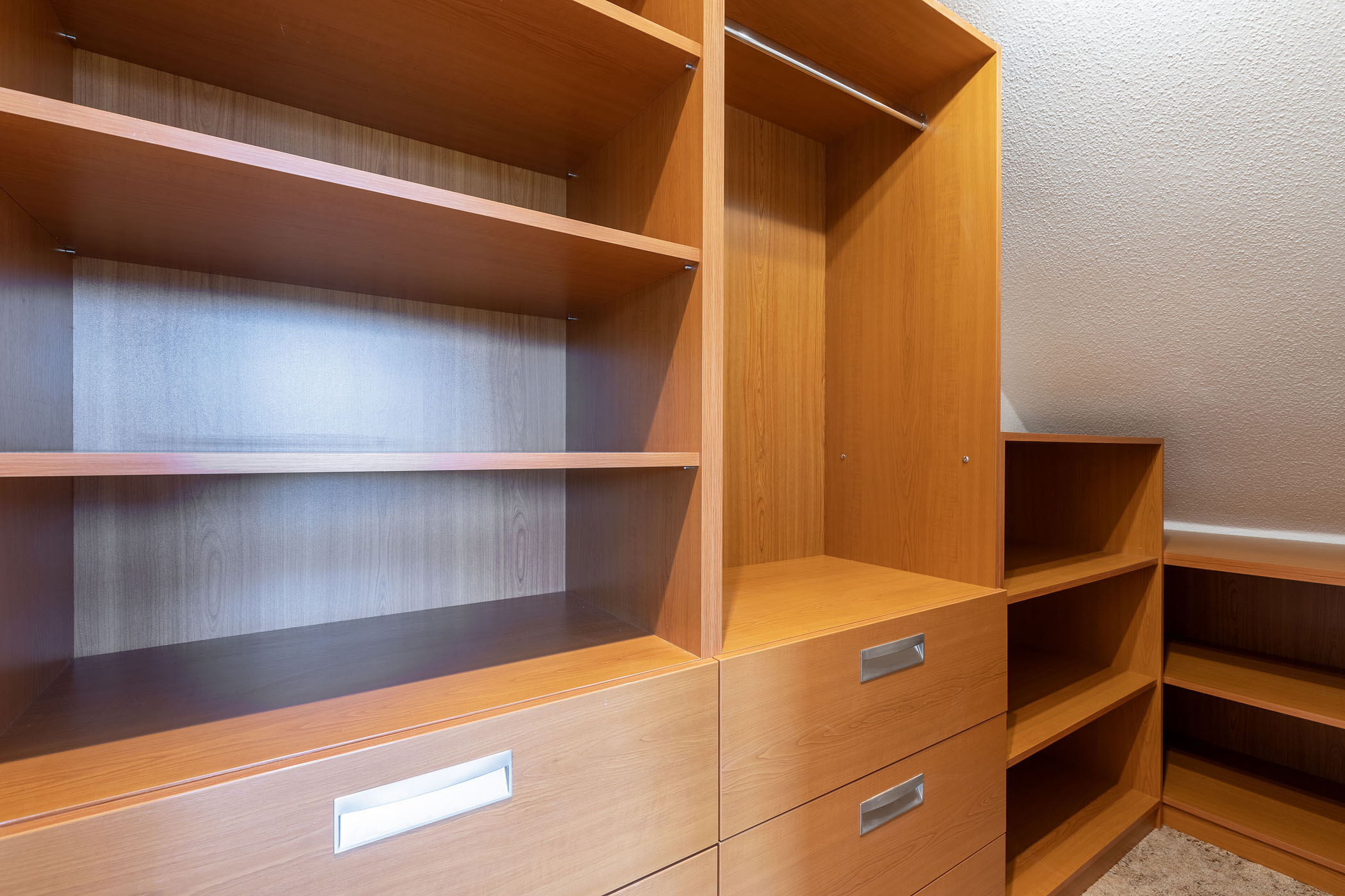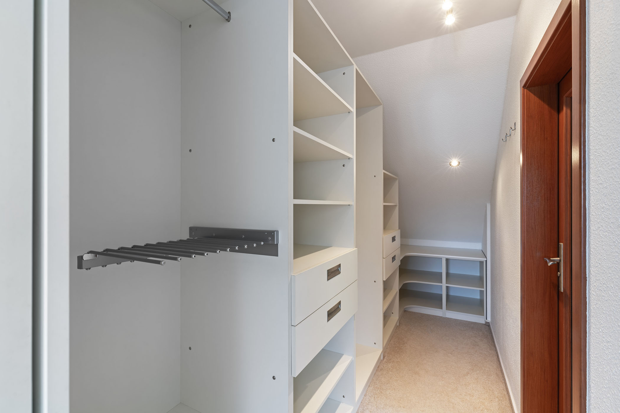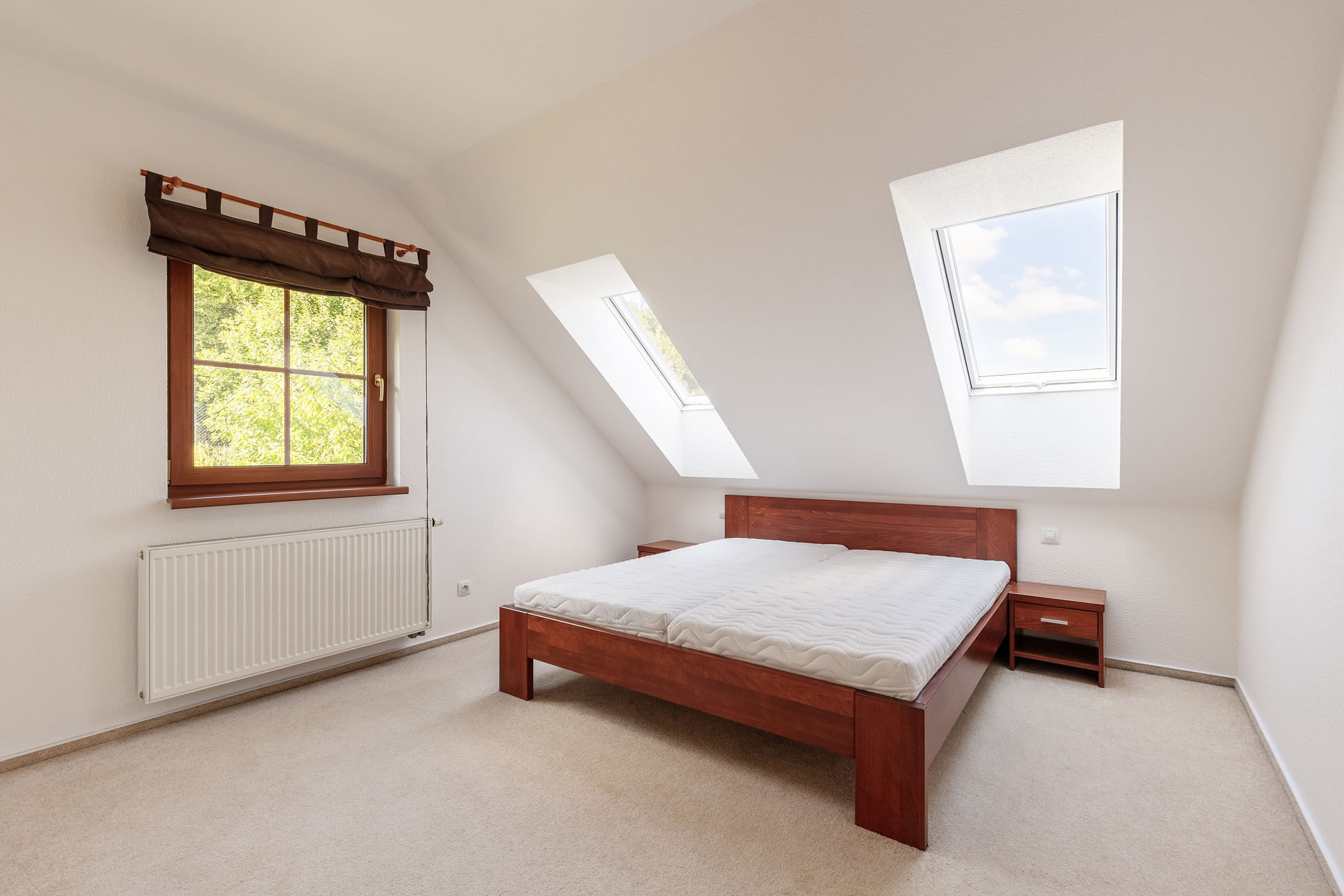 Podkroví nabízí klidovou zónu domu. Hlavní ložnice má vlastní šatnu a soukromou koupelnu. Další dva pokoje disponují šatnami a sdílenou koupelnou. Celé patro je světlé a vzdušné, s dostatkem úložných prostor.