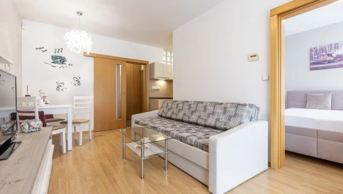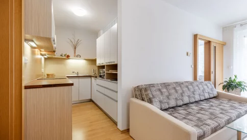 Výhodou bytu je prostorná komora, sloužící jako technická místnost o velikosti 3,6 m2. Kromě kotle na vytápění a ohřev vody je zde dostatek prostoru na úložné systémy. Zádveří lze od předsíně oddělit posuvnými dveřmi, můžete tak odclonit přechodovou zónu od vstupu do bytu.